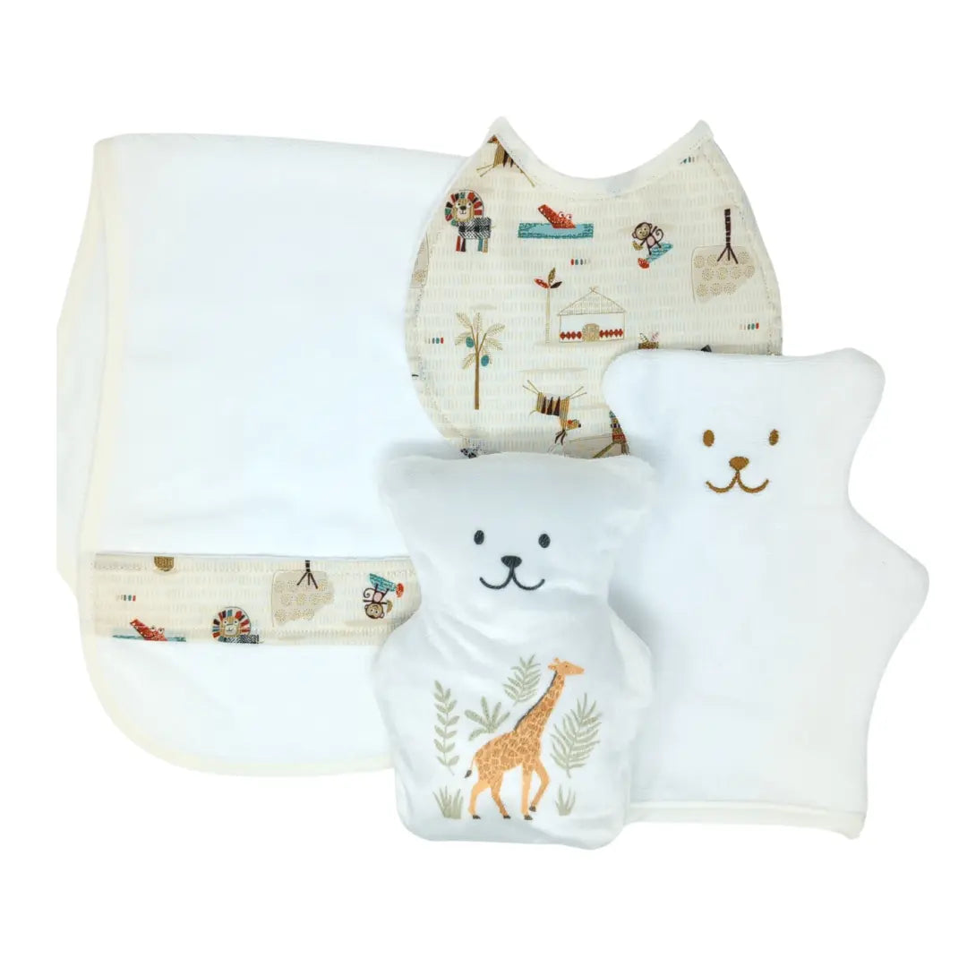 ¿Estás buscando un set de regalo para recién nacido? Béké-Bobo ofrece un práctico y monísimo set que incluye un paño eructador, un babero muy absorbente, una toallita con forma de oso y un pequeño oso terapéutico.