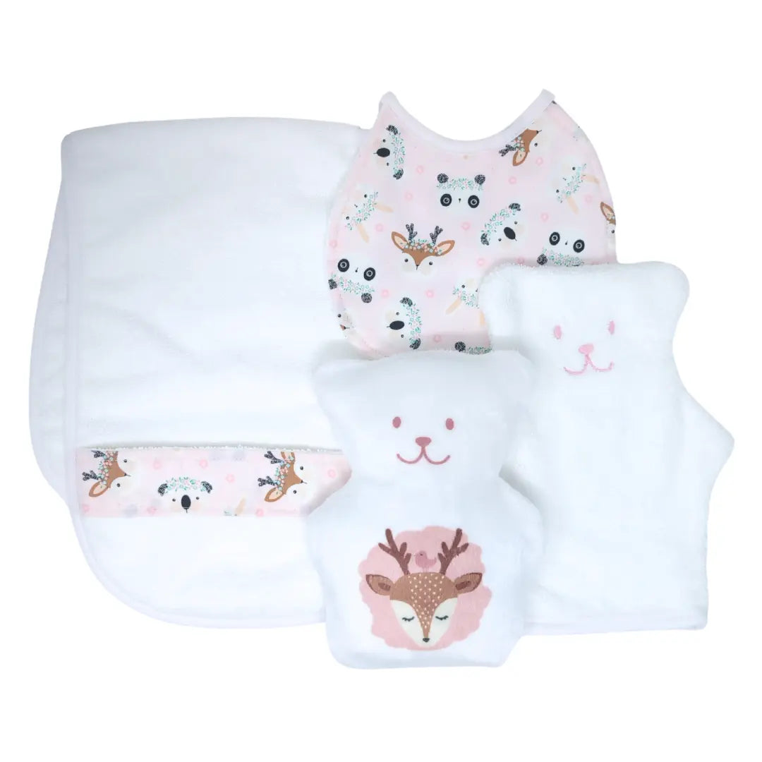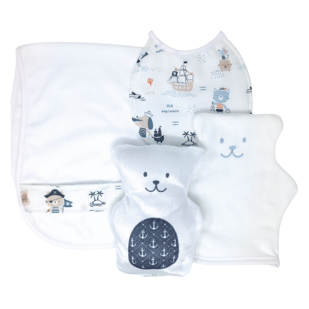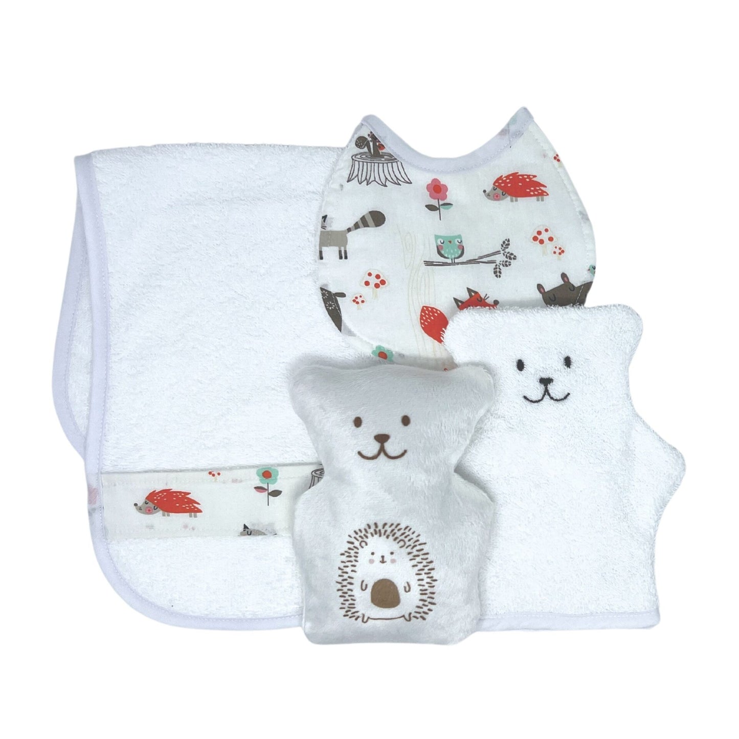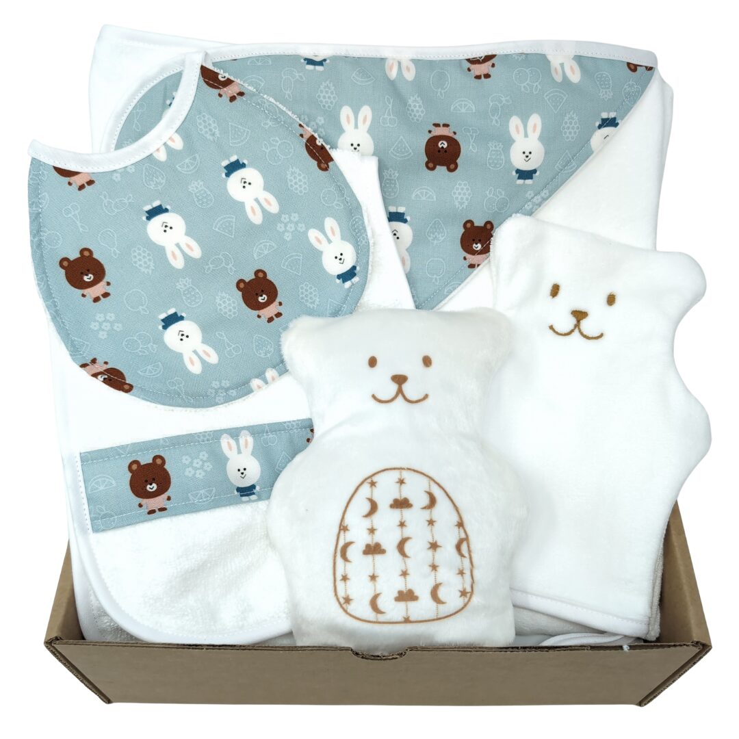 NUESTROset de regalo para recién nacidosIncluye un paño eructador, un babero pequeño, una toallita y un osito terapéutico para aliviar todos los dolores y molestias del bebé.