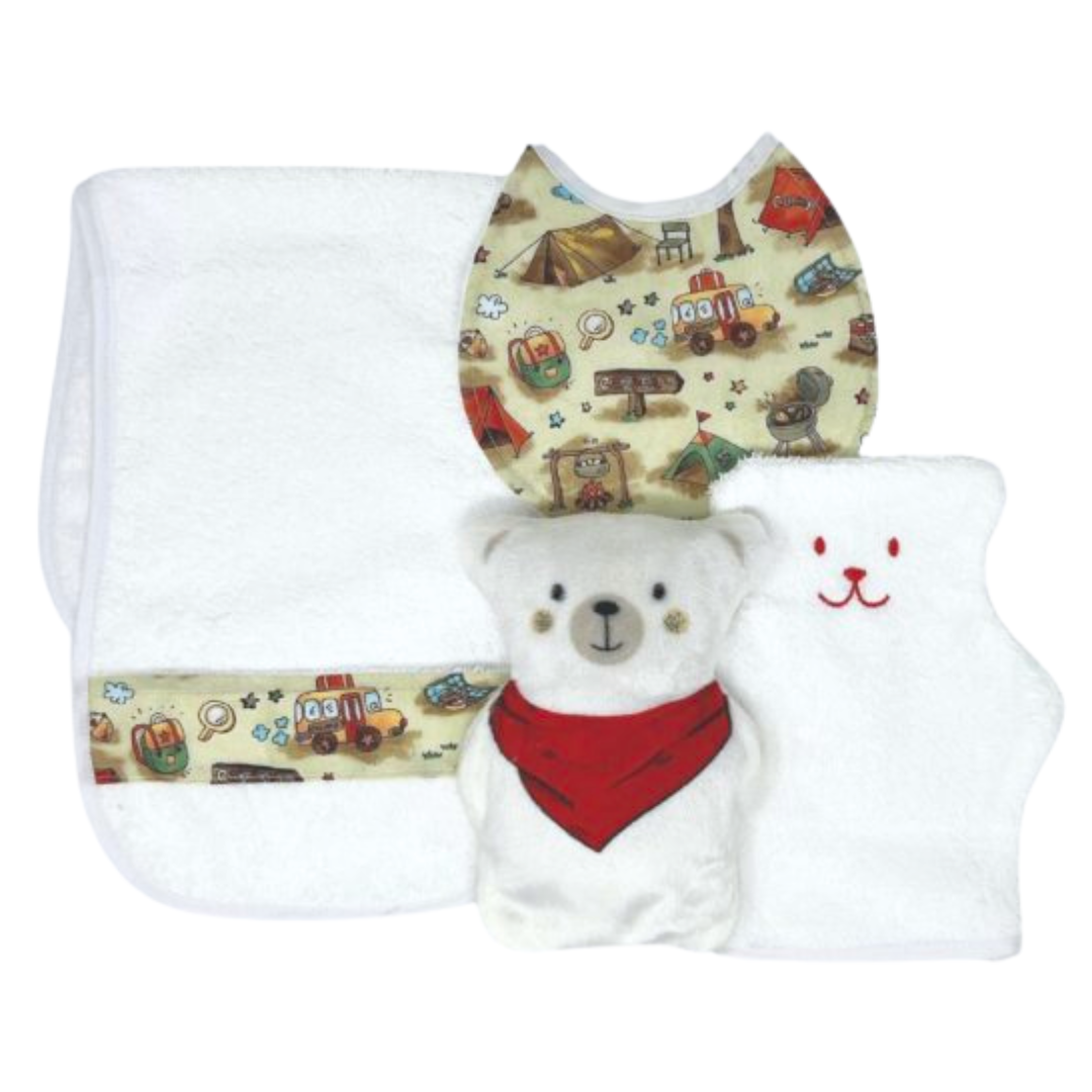 NUESTROjuego de bañoIncluye una toalla de baño grande con capucha y una toallita con forma de oso.