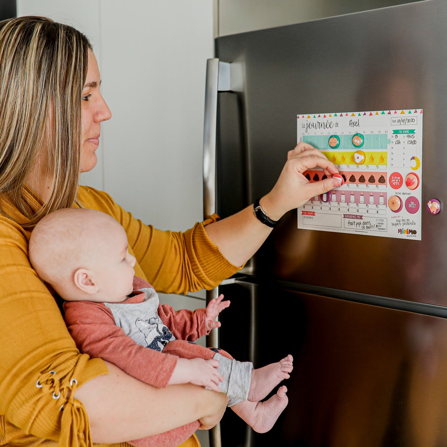 Déplace l’aimant selon le nombre de boires. Inscris l’heure, la durée et la quantité (en ml ou en oz) au besoin. Indique « A » s’il s’agit d’un allaitement (si vous n’allaitez pas exclusivement).