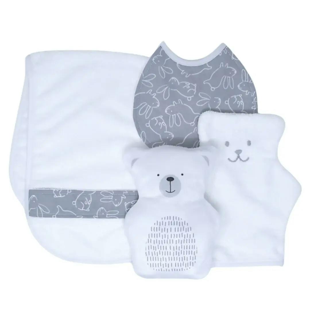 Facile d’entretien : la housse de l’ourson, le bavoir, le gant et la serviette pour le rot passent à la laveuse